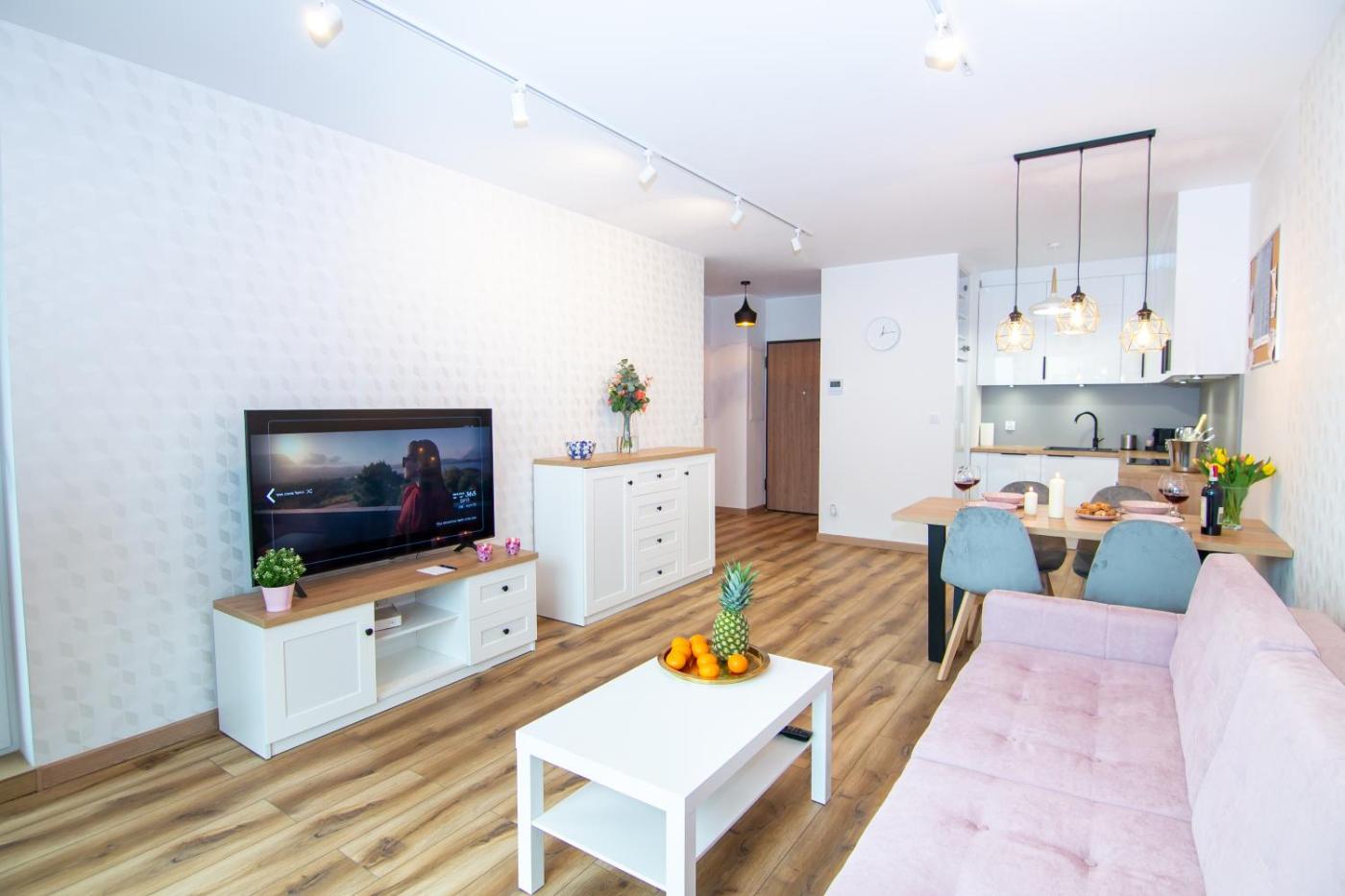 Apartament z 1 sypialnią. The apartment features tumble dryer, heating, as well as a shared bathroom boasting a shower and a hairdryer. Guests can make meals in the kitchen that comes with a stovetop, a refrigerator, a dishwasher and kitchenware. Featuring a terrace, this apartment also offers a washing machine, a tea and coffee maker and a flat-screen TV with streaming services. The unit offers 2 beds. Apartament - 4 osobowy. Powierzchnia pokoju ok.: 46 mkw.
