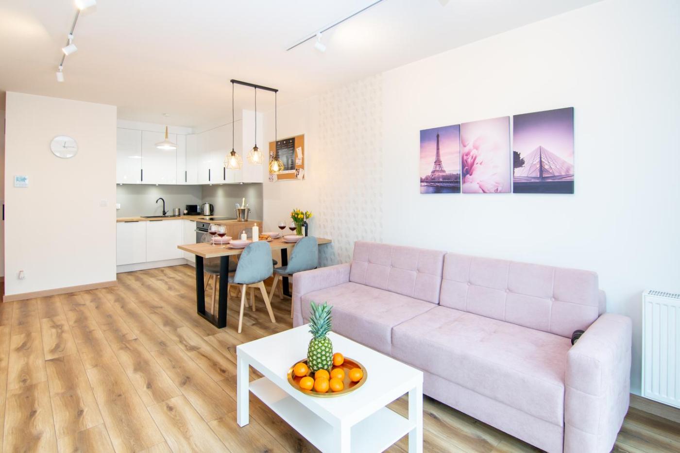 Oferta apartamentu obejmuje sypialnię (1), salon, kuchnię z pełnym wyposażeniem, w tym lodówką i ekspresem do kawy, a także łazienkę (1) z prysznicem oraz suszarką do włosów. W apartamencie zapewniono ręczniki i pościel.