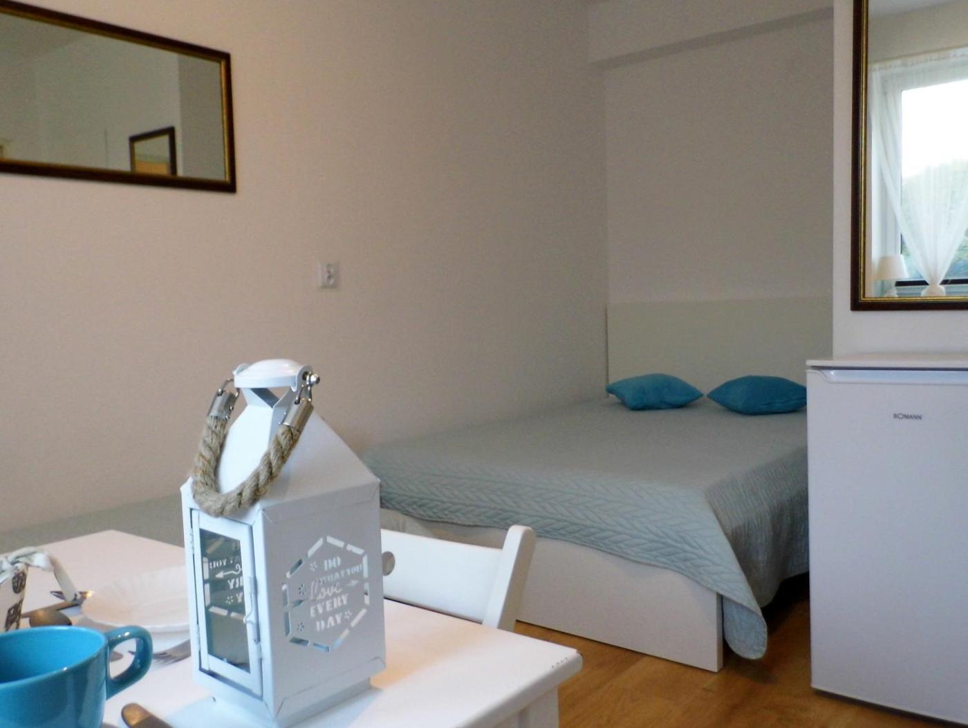Pokój Dwuosobowy z widokiem na jezioro. The double room includes a private bathroom fitted with a shower. The double room features a flat-screen TV, a wardrobe, an electric kettle, heating as well as lake views. The unit has 1 bed. Pokój Dwuosobowy - 2 osobowy. Powierzchnia pokoju ok.: 13 mkw. ;