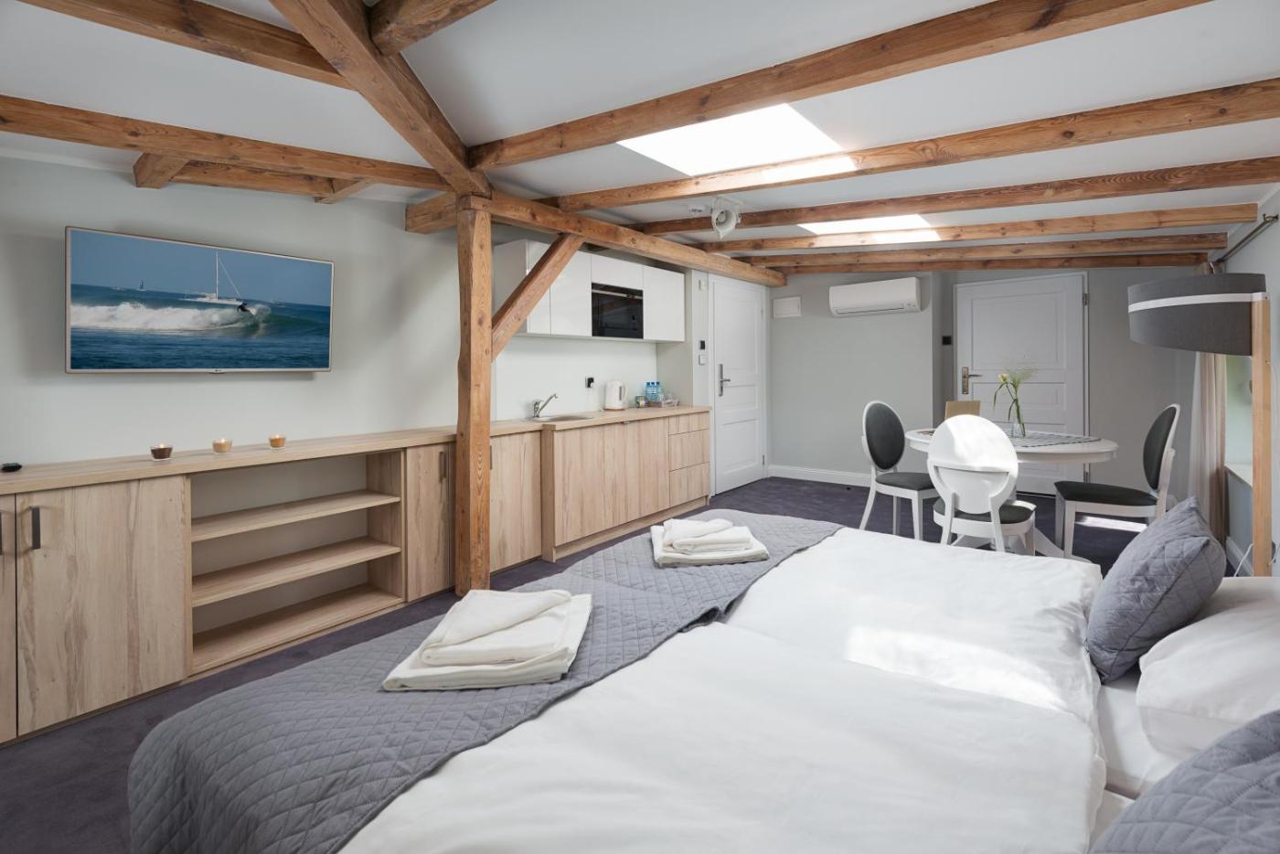 Pokój Dwuosobowy typu Comfort. Guests will find a stovetop, a refrigerator, kitchenware and a microwave in the well-fitted kitchen. The double room also provides guests with a barbecue. The spacious double room provides air conditioning, a tea and coffee maker, a terrace with city views as well as a private bathroom featuring a walk-in shower. The unit offers 1 bed. Pokój Dwuosobowy - 2 osobowy. Powierzchnia pokoju ok.: 27 mkw. ;